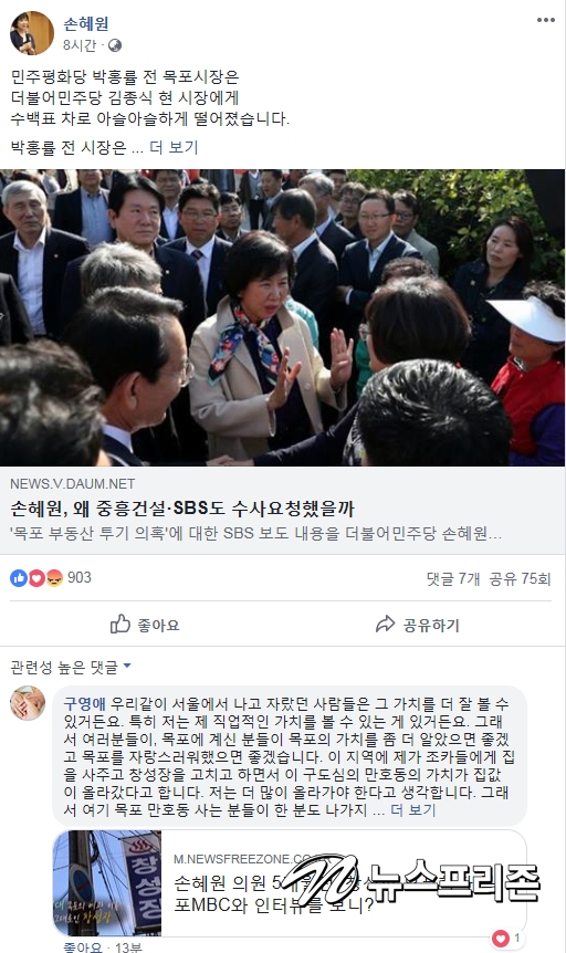 손혜원 의원은 페이스북 등을 통해 거듭 자신의 결백을 주장하고 가운데 손혜원 의원이 사들인 건물 주변 사업에 이른바 '쪽지 예산' 60억 원이 책정됐다는 한국당 송언석 의원의 주장까지 제기됐는데, 목포가 지역구인 민주평화당 박지원 의원은 자신이 힘써 편성한 예산으로 손 의원과 무관하다고 대신 반박했다. 특히 검찰 수사 요청의 필요성을 박 의원이 제기한 데 대해 “서산온금지구 아파트 조합원 여러분, 중흥건설, 그리고 SBS 취재팀, 여기까지 왔는데 같이 갑시다”라며 “모든 의혹을 밝히자. 다같이 검찰 수사를 요청하자”고 했다.