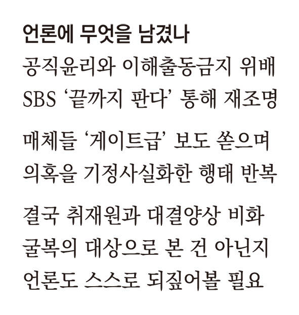 언론의 과잉 보도 배경에 의혹을 기정사실화하고 몰아붙이는 식의 잘못된 관행이 작동했다는 지적도 있다. 진실에 접근하는 과정으로 보도가 이뤄졌지만 결국엔 언론과 취재원 간 대결로 비화하고, 끝장싸움 양상으로 흘렀다는 것이다. 한 지상파 방송사 기자는 “취재원과 관계를 승패로 놓고, 언론이 이겨야 한다는 잘못된 관행이 나타난 것”이라며 “우리 언론이 취재원을 굴복의 대상으로 바라본 것은 아닌가 한다”고 말했다.