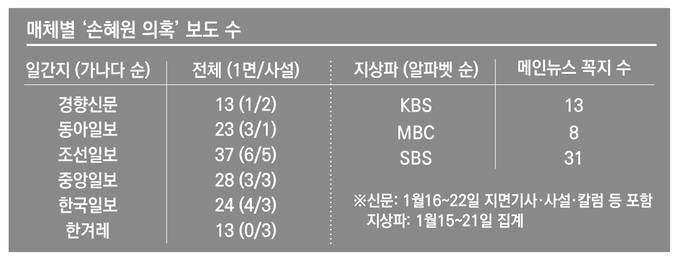 조선일보의 경우 16~22일 지면에서 기사, 사설, 칼럼 등 포함해 손혜원 관련 보도가 37건이었다. 그 기간 1면 톱만 3차례, 사설은 5일 연속 실었다. 단기간에 이렇게 보도량이 많은 것은 매우 이례적이다. 한 종합일간지 논설위원은 “투기 여부, 이해충돌 소지가 있는지 다툴 사안을 게이트처럼 다루는 게 적절한지 모르겠다”며 “취재경쟁이 지나치게 과열된 측면이 있고, 보도 또한 일방적이다”고 했다.