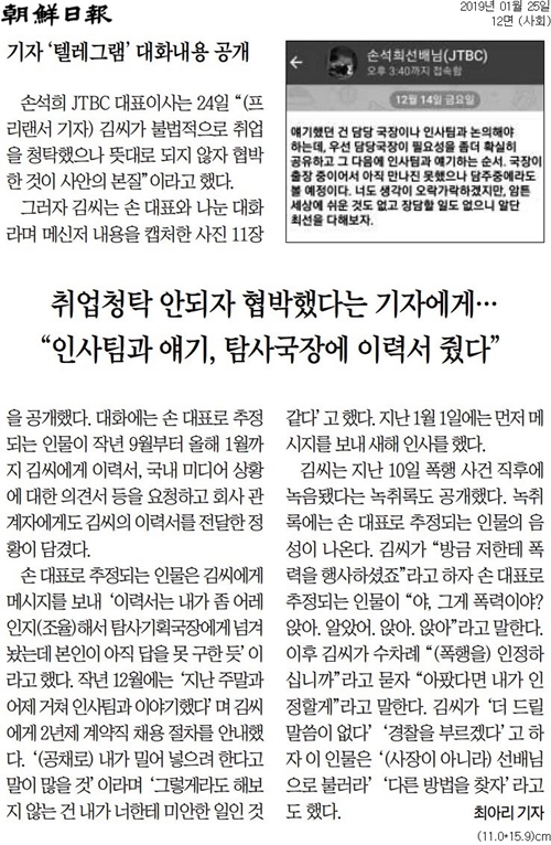 손 사장이 김씨와 대화·만남을 지속한 배경도 쟁점이다. 손 사장 입장에선 취업 청탁하는 김씨가 반가울 리 없다. 김씨 공개 자료를 보면 손 사장은 5개월 간 일자리를 찾아보고 있다는 입장을 전달했다. 김씨와 손 사장은 지난 12월에도 한 차례 더 만났다.