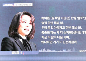 [뉴스프리존] 정치권에 촉각을 곤두세운 윤석열 국민의힘 대선후보의 부인 김건희씨의 이른바 ‘7시간 통화’가 공개됐다. 지난해 12월 26일 이력서 등에 허위이력으로 사과 기자회견 이후 김건희씨가 다시 한번 정치권 전면에 등장한 것이다. MBC 탐사보도프로그램 '스트레이트'는 지난 16일 저녁 방송에서 윤석열 국민의힘 대선후보 배우자 김건희씨와 서울의소리 이명수 기자가 지난해 7월부터 12월까지 52차례 나눈 통화 내용 일부를 공개했다. 방송 전 국민의힘이 방송금지 가처분 신청을 제기하고, MBC에 항의 방문을 하는 등 정치적 이슈로