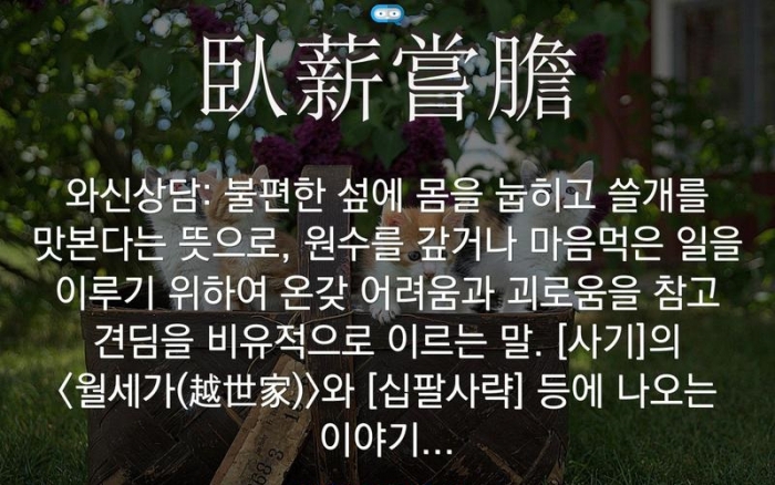 부차는 아버지의 원수를 갚기 위해 뜰에다 장작개비를 쌓아놓고 발가벗은 채 그 위에서 잠을 잤습니다. 호화로운 비단 요를 깔고 자며 몸을 편안하게 하거나, 궁녀들과 쾌락에 빠지면 무사안일하게 되기 때문이었습니다. 부차는 원수를 갚기 위해 편안함을 물리치고 몸을 불편하게 둠으로써 한시도 긴장을 풀지 않은 것입니다.