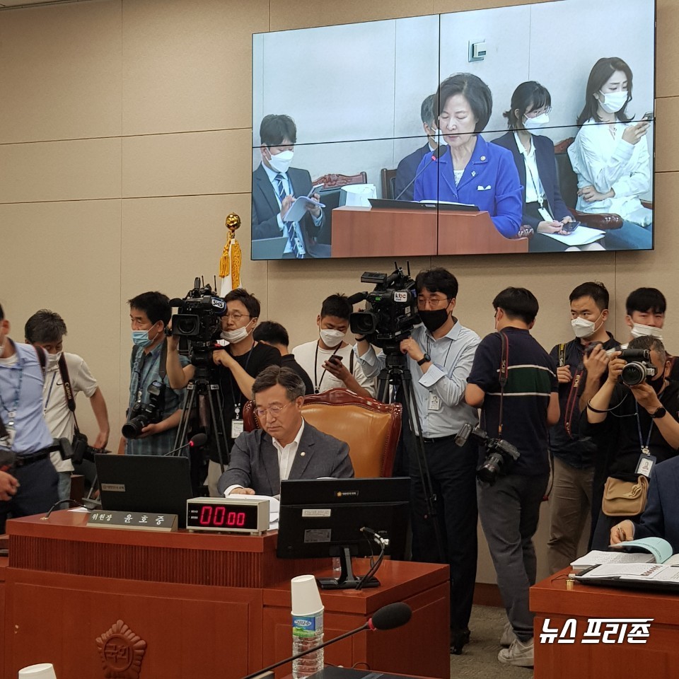 [뉴스프리존,국회=윤재식 기자] 추미애 법무부 장관이 18일 국회 법제사법위원회 출석 선서를 하고있는 가운데 사회를 보고있는 윤호중 법사위위원장이 서류를 검토하고 있다. 2020.6.18