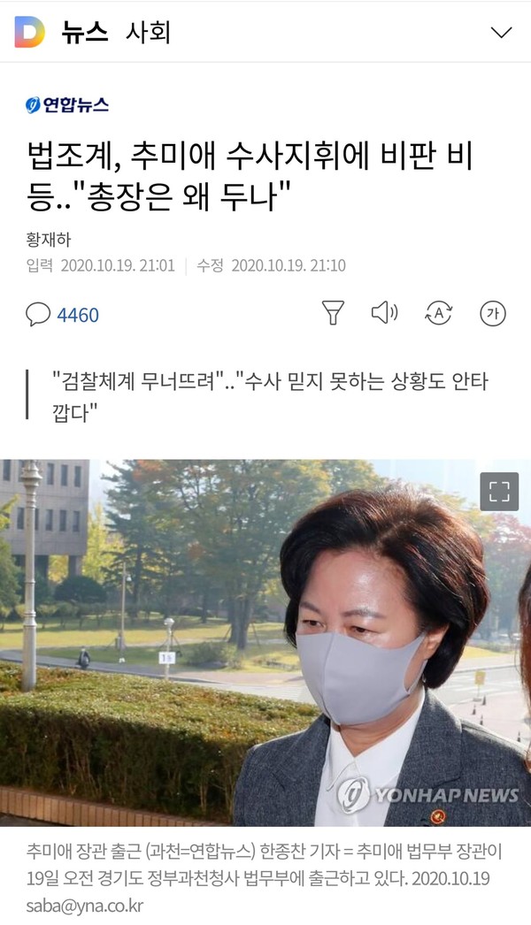이것은 한겨레나 경향의 어제 1면 제목처럼 ‘추 법무-윤 청장의 충돌’이 아니며 오늘 연합 기사처럼 이미 썩은 채 한 몸이 돼 버린 ‘법조계 인사들’만 인용해 “검찰체계 무너뜨린다”고 해석할 일은 더더욱 아니다.