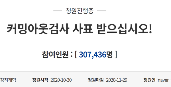 지난달 30일 올라온 청와대 국민청원 게시판에는 '커밍아웃 검사 사표 받으십시오'라는 제목의 청원은 불과 만2일 만인 2일 현재 307,436명이 동의해 검찰에 대한 국민 불신과 검찰개혁에 대한 국민의 바람이 얼마나 뜨거운지 가늠된다.