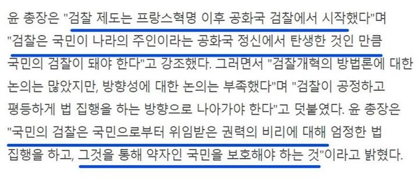 윤 총장은 “검찰제도는 프랑스 혁명 이후 ‘공화국 검찰’에서 시작됐다"라며 "검찰은 국민이 나라의 주인이라는 공화국 정신에서 탄생한 것인 만큼 국민의 검찰이 되어야 한다. 국민의 검찰은 국민으로부터 위임받은 권력의 비리에 대해 엄정한 법 집행을 하고 약자인 국민을 보호해야 한다”라고 말했다.