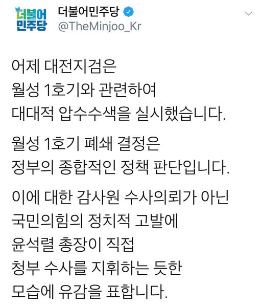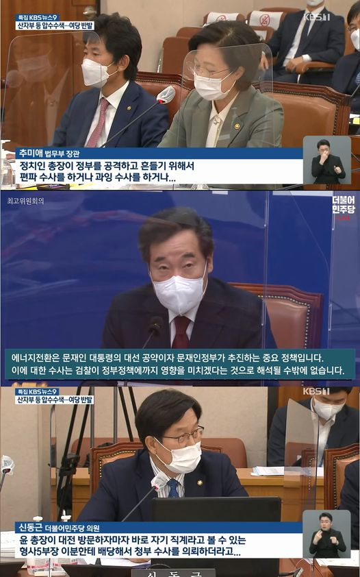 김태년 원내대표도 "이번 수사는 명백한 검찰권 남용"이라며 "정부의 에너지 전환 정책을 수사 대상으로 삼은 건 검찰의 과잉수사"라며 "권력형 비리가 있었던 것도 아니지 않느냐. 권력형 부패가 있었던 것도 아니지 않느냐. 검찰이 수사권을 남용해 국정 운영에 개입하는 건 위험 수위를 넘는 국정 흔들기"라고 비판했다.
