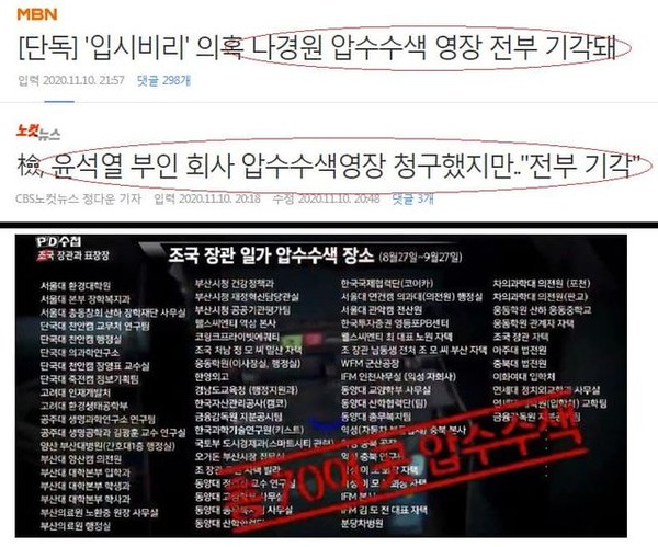 법원은 또 최근 중앙지검 형사7부(이병석 부장)가 나경원 전 의원의 입시비리 의혹과 관련해 나 전 의원의 주거지에 대해 청구한 압수수색 영장 등도 전부 기각으로 때렸다.