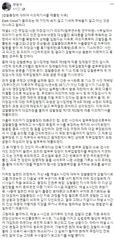 한 부장은 "채널 A사건의 초창기 즉, 나중에 알려진 바와 같이 물증인 휴대폰과 노트북이 수차례 초기화되는 동안 대검에서 검찰총장의 사건 지휘 과정을 직접 몸으로 겪으며 경험한 그 생생한 상황과 장면들이 뇌리에 깊이 각인되었고, 결국 그때나 지금이나 채널 A 사건의 진상 규명에 어떻게든 지장을 주거나 주려는 행위라는 점에서는 변함없이 동일하였기 때문이다"라고 했다.