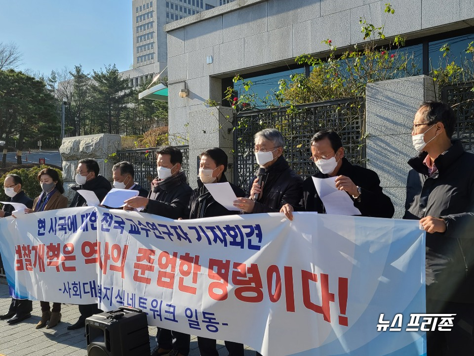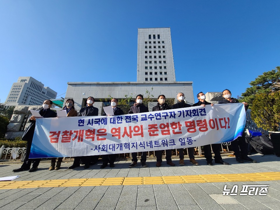 [서울 =뉴스프리존]이명수 기자= 정치, 경제, 사회, 문화, 교육, 언론 제반 분야의 대개혁을 촉구하는 교수·연구자 모임 <사회대개혁 지식네트워크(이하 네트워크)>가 1일 오전 서울 서초동 대검찰청 정문에서 시국선언을 발표하고 기자회견을 개최했다.