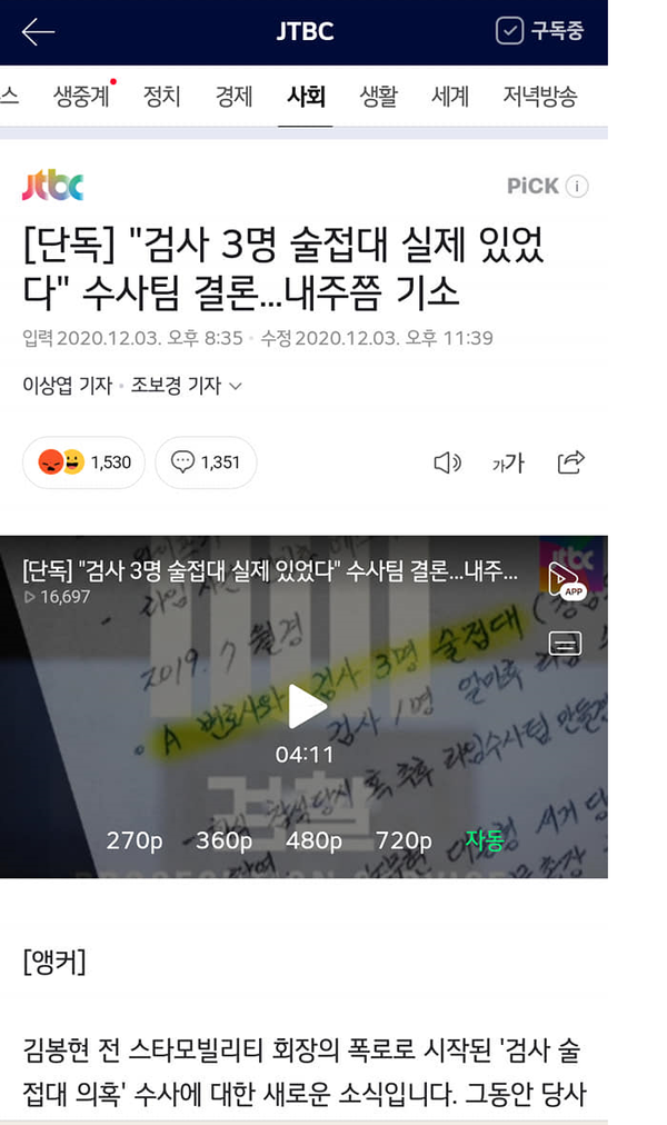 이주혁 의사는 "당사자로 지목된 검사들은 전부 거기 간적 없다고 부인했지만 수사결과 거짓말이었음"이라며 "조중동 등은 적극적으로 검사들 편을 들려 갖은 애를 써서 덮으려고 애써온 사건. Jtbc의 집요함이 돋보인다"라고 했다.