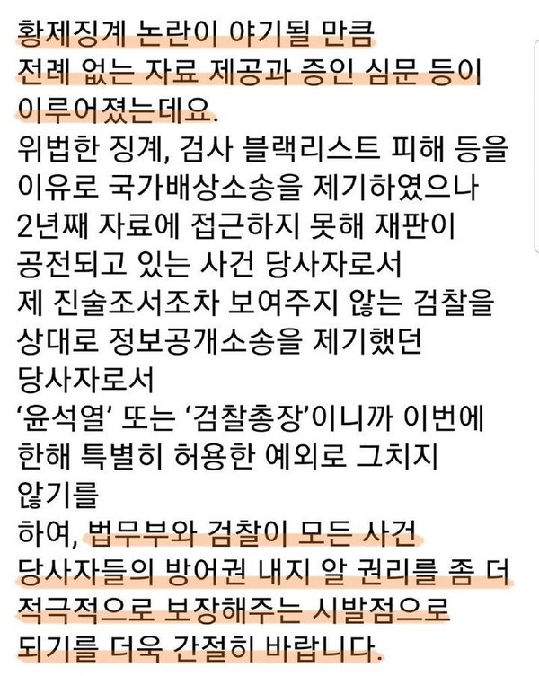 아울러 임 부장검사는 "'윤석열' 또는 '검찰총장'이니까 이번에 한해 특별히 허용한 예외로 그치지 않고 모든 법무부와 검찰이 모든 사건 당사자들의 방어권 내지 알 권리를 좀 더 적극적으로 보장해주는 시발점으로 되길 간절히 바란다"라며 소송, 징계 당사자의 자료접근 등을 전면 허용해 줄 것을 촉구했다.