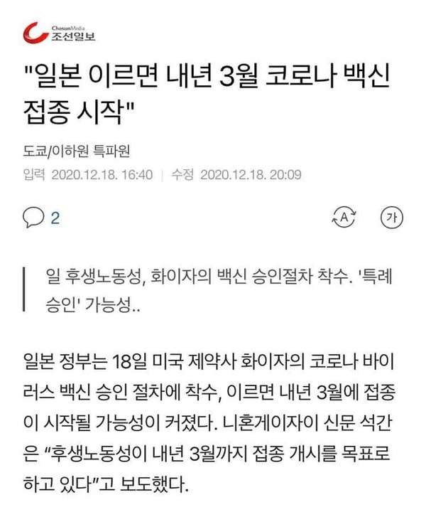 그러면서 기 교수는 조선일보 기사의 사례를 들었다. 조선일보는 백신 접종과 관련해 일본은 ‘이르면 3월’ 한국은 ‘빠르면 2~3월’이라고 보도했다.