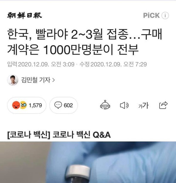 하루 신규 확진자가 천 명대에 진입하면서 '백신 접종' 촉구 기사가 드세지고 있다. 아울러 언론과 야당이 백신 구입을 등한시해 코로나 방역이 무너졌다는 등 '백신 위기론'을 키우며 연일 정부를 집중 포화하고 있다.