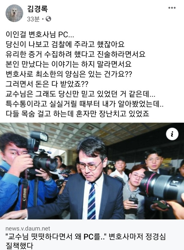 김경록 씨는 이와 관련해 지난달 24일자 중앙일보 [ 교수님 떳떳하다면서 왜 PC를.." 변호사마저 정경심 질책했다] 기사를 링크했다. 중앙일보는 이인걸 변호사의 말을 빌려 정 교수를 파렴치한 인물로 기사를 냈다.
