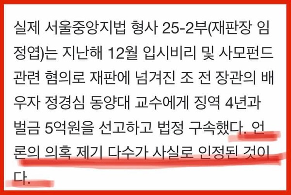 그는 또 지난해 12월 28일 [법원이 말한 ‘정경심 위해 허위 증언’ 누구길래]라는 제하의 경향신문 기사를 링크하고 "너무 악의적인 기사이다"라며 "기자가 기사로 협박을 하고 있다"라고 되받아쳤다.