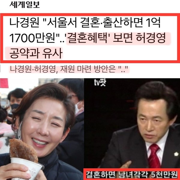 나 전 의원의 이날 공약이 지난달 20일 허경영 국가혁명당 대표가 서울시장 보궐선거 출마를 선언하며 결혼수당 및 연애수당이 포함된 5대 정책을 공개했는데 그것과 흡사하게 황당하다는 취지의 조롱성 댓글이다.
