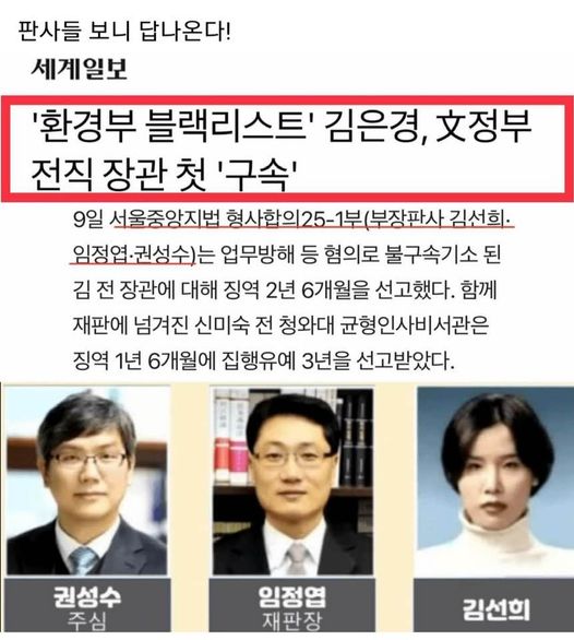 이어 "김은경 前장관은 2019년 3월에 이미 구속영장이 기각됐고 2년 동안이나 불구속 재판을 받고있는 상태인데, 피고인이 증거인멸을 할 가능성이 있다고 법정구속까지 한 것은 납득할 수 없고, 재판부 구성원의 정치성향에 기인한 '보복판결'이라고 할 수 밖에 없다. 이 재판부에 소위 '양승태 사단'이라고 알려져 있는 분이 포함되어 있음을 주목한다"라고 재판부 구성원에 불신을 나타냈다.