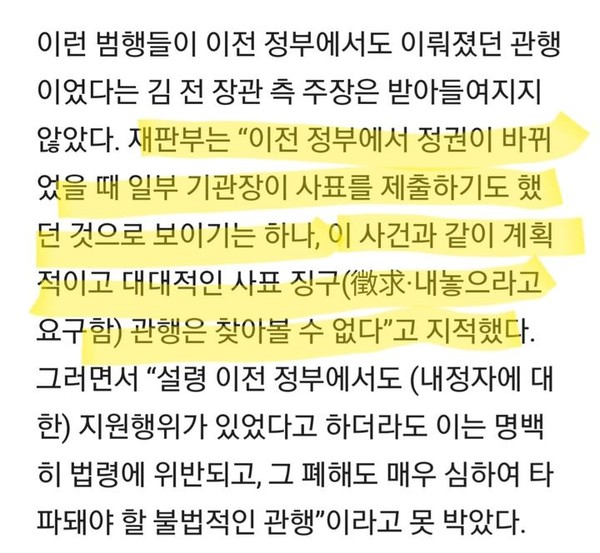 또한 "그러면서 이전 정부와 비교하는 게 뒤가 구리고 켕겼는지 ‘설령 이전 정부에서도 그런 행위가 있었다고 하더라도 이는 명백히 법령에 위배되고, 그 폐해도 매우 심하여 타파해야 할 불법적인 관행’이라는 부연 설명을 붙였단다"라고 했다.