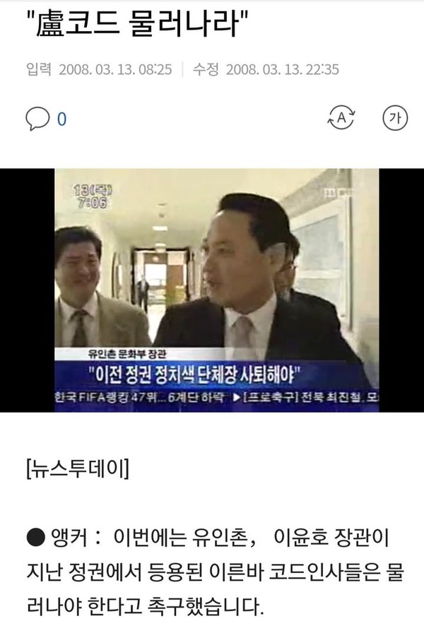이어 "이명박 정부가 출범하자 이명박의 측근으로 불리던 실세 장관(유인촌)을 비롯하여 눈깔 부라리며 노무현 정부에서 임명된 기관장은 모두 나가라는 엄포를 쏟아냈다"라며 "코드가 맞지 않으니 나가라는 거다. 그런 요구를 할 수도 있다. 공공기관의 경우, 자율경영도 중요하지만 그렇다고 소신을 내세워 정부 정책과 엇나가는 것도 곤란하니까"라고 했다.