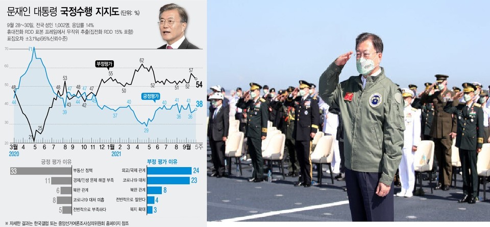 주요 상승 요인으로는 문 대통령이 추석 연휴 기간 유엔총회에 참석해 평화를 전제로 한 종전선언을 천명하면서 국제관계에서 외교를 잘한다는 외교력에 대한 평가로 파악된다. 따라서 직무 수행 긍정평가 이유도 '외교/국제관계'(24%)가 1순위로 조사됐다. 직전 조사 대비 11%p나 대폭 상승했다. 이어 '코로나19 대처'(23%), '북한 관계'(6%), '전반적으로 잘한다'(4%), '복지 확대'(3%) 순이었다.