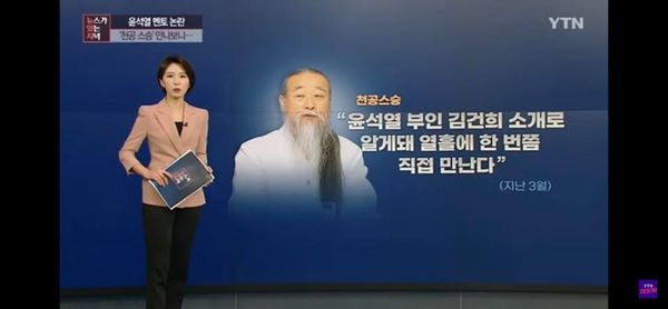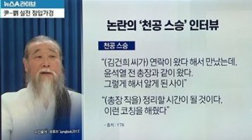 천공스승은 지난 7일 YTN 인터뷰에서 “윤 전 총장 부부를 여러 차례 만나 검찰총장 사퇴 시점 등에 대해 조언을 해줬다”라며 "김건희 씨 소개로 알게돼 열흘에 한번쯤 직접 만났다. 검찰총장 사퇴 관련 조언도 했다"라고 말했다.