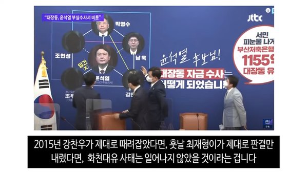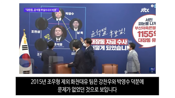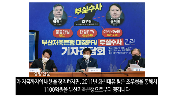 특히 같은 시기에 비슷한 대출건 관련자들은 기소했지만 부실대출의 커다란 축으로 책임이 컸던 대장동 '화천대유팀'은 건드리지 않고 빠져 나가게 만들었다. 다음 자막이 들어간 사진들을 보면 윤 후보가 특검을 반대하는 상황이 이해가 갈 수밖에 없다. 윤석열 중수부의 '직무유기'가 일목요연하게 드러난다.