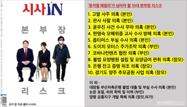 시사주간지 '시사IN'은 23일 <‘윤석열 패밀리’가 넘어야 할 10대 본부장 리스크> 제하로 대통령이 되겠다고 제1야당 후보로 나선 윤 후보와 부인 김건희씨, 장모 최은순씨의 비위혐의를 일목요연하게 정리해 기사를 냈다. 한 네티즌은 기사와 관련해 "기자가 쓰면서도 이게 제1야당 대선후보 가족 프로필인지 범죄 집단 프로필인지 헷갈렸을거 같다"라고 직격했다.