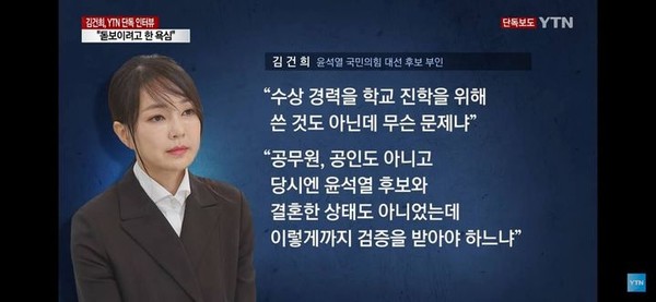 김씨는 14일 'YTN' 단독 인터뷰에서 "수상 경력을 학교 진학을 위해 쓴 것도 아닌데 무슨 문제냐?"라고 강변했다. 아울러 "공무원, 공인도 아니고 당시엔 윤 후보와 결혼한 상태도 아니었는데 이렇게까지 검증을 받아야 하느냐"라고 되려 취재진에게 되물어 심각한 도덕불감증을 드러냈다.