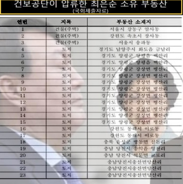 민주당은 이날 최씨의 부동산 소유 목적과 재산 증식 과정의 문제점을 지적하며 국민 앞에 소상히 밝힐 것을 촉구했다. 최씨는 앞서 부동산 압류를 피하기 위해 20억 상당의 토지를 외손주에게 증여했다는 의혹도 나왔다.