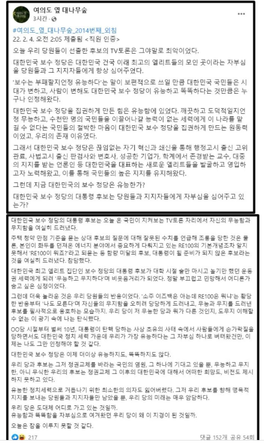 작성자는 “대한민국 최고 엘리트 집단인 보수 정당의 대통령 후보가 대학 시절 술만 마시고 놀기만 했던 운동권 세력에게 되려 '무능하고 무지하다'며 비웃음거리가 됐다”라며 “정말 부끄럽고 민망해서 어디론가 숨고 싶은 심정”이라고 했다.