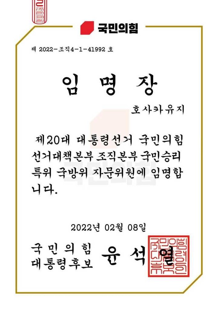 호사카 교수는 "국민의힘으로부터 아래와 같이 본인에게 자문위원 임명장이 도착해서 여기에 올립니다"라며 "저는 임명을 요청한 바도 없고 수용한 바도 없습니다. 혹시 국힘의 선대위 명단에 제 이름이 들어가 있다면 즉각 삭제를 부탁드립니다"라고 촉구했다.