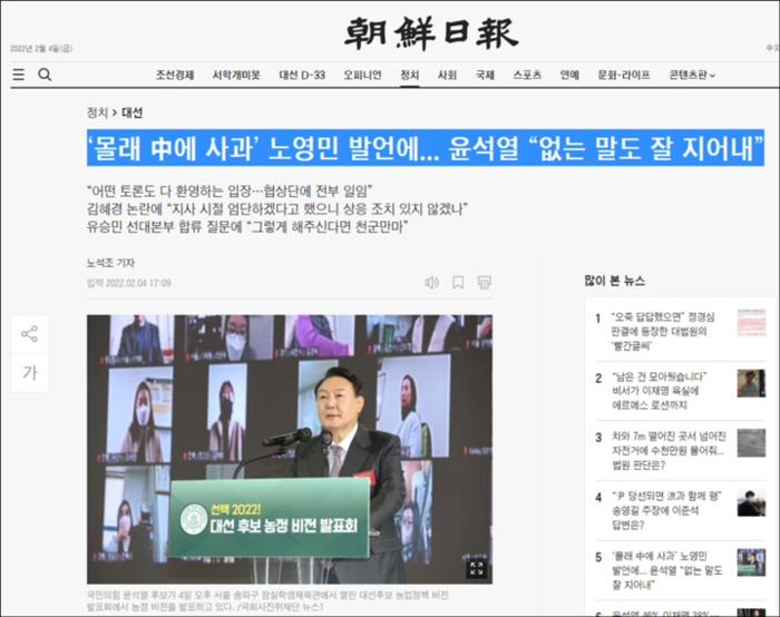 노영민 전 대통령 비서실장은 얼마전 BBS라디오 방송에서 "윤 후보 측은 앞에서는 반중 발언을 쏟아내지만, 뒤에서는 몰래 중국 측에 사과성 해명을 하는 등 이중적 플레이를 한 것으로 알고 있다"라고 말한 바 있다. 이에 대해 윤 후보는 "참 없는 말도 잘 지어낸다"라고 부인했고 국힘은 "허위사실"이라며 "책임을 묻겠다"라고 비난했다.