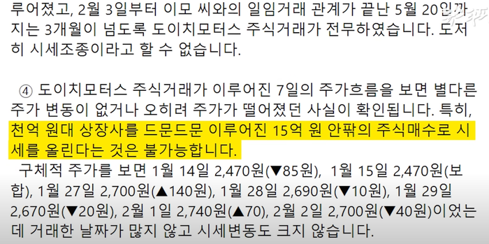 이양수 수석대변인은 입장문에서 관련 기사 내용을 언급하며 "하루에 한 번 꼴도 되지 않는 주문 내역으로 어떻게 주가를 올릴 수 있는지 의문"이라며 "애초에 시세조종에 가담할 수 없는 상황이다. 이 보도들은 출처부터 불법으로 강력한 법적조치를 하겠다"라고 목소리를 높였다.