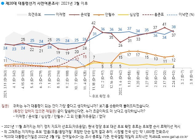 전국적으로는 이재명 후보 지지율이 38%, 윤석열 후보 지지율이 37%로 오차범위 내 초접전 양상을 보이고 있으며, 안철수 후보 12%, 심상정 후보 4%, 기타후보 2%로 집계됐으며 7%는 의견을 유보했다.