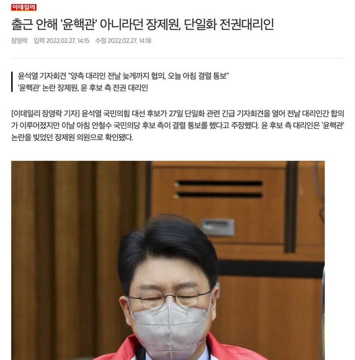 하지만 장제원 의원은 보란 듯이 윤석열 후보의 입을 통해서 건재를 과시했다. 윤 후보는 지난달 27일 안철수 후보와의 단일화 협상 과정을 설명하면서 "장제원, 이태규 의원(안철수측)이 양측 전권 대리인"이라고 공개했다.