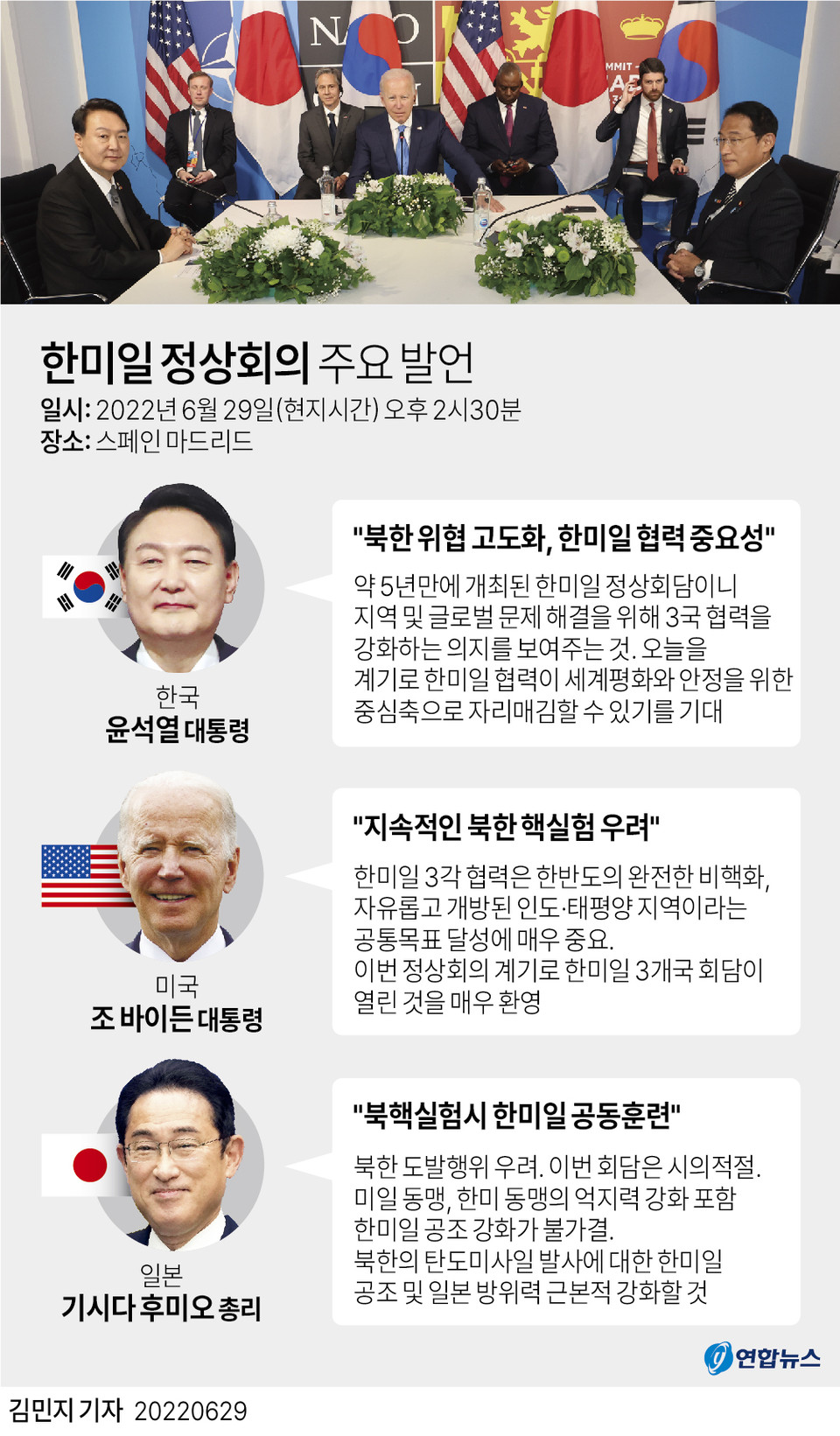 기시다 총리는 이날 오후 스페인 마드리드 북대서양조약기구(NATA·나토) 정상회담장에서 열린 한미일 3개국 정상회담에서 이같이 말했다고 교도통신이 보도했다.