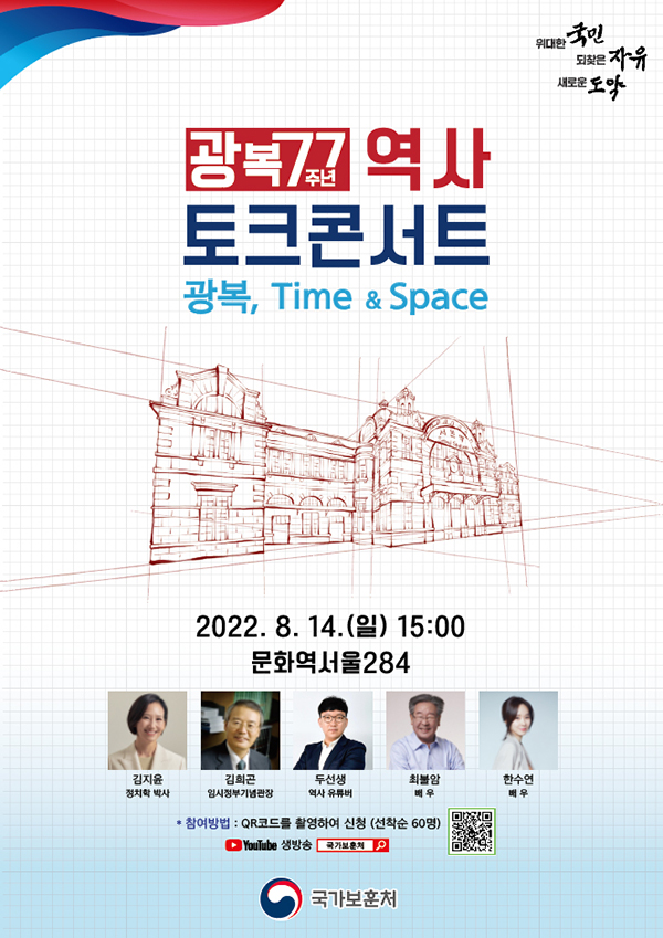 보훈처 유튜브 채널로도 생중계되는 이야기공연에는 김희곤 국립대한민국임시정부기념관장을 비롯해 역사 유튜버 한영준, 김지윤 정치학 박사, 배우 최불암, 한수연 보훈처 정책자문위원, 보훈 사적지 탐방단 대학생 등 60여 명이 참석한다.