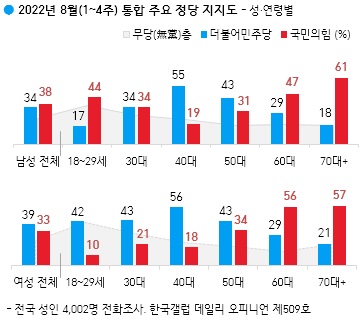 월별 통합 양당 지지도를 보면 6월 국민의힘 43%, 더불어민주당 29% → 7월 38%, 33% → 8월 35%, 37%다. 20대 남녀 국민의힘 지지도는 6월 48%·18% → 7월 46%·18% → 8월 44%·10%, 30대 42%·24% → 35%·23% → 34%·21%로 나타났다.