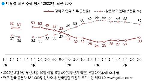 한국갤럽이 지난 13일부터 15일까지 전국 만18세 이상 1000명을 대상으로 실시한 여론조사 결과 윤 대통령이 '잘한다'는 답변은 33%, '잘못한다'는 답변은 59%로 나타났다. 나머지 8%는 답변을 유보했다.