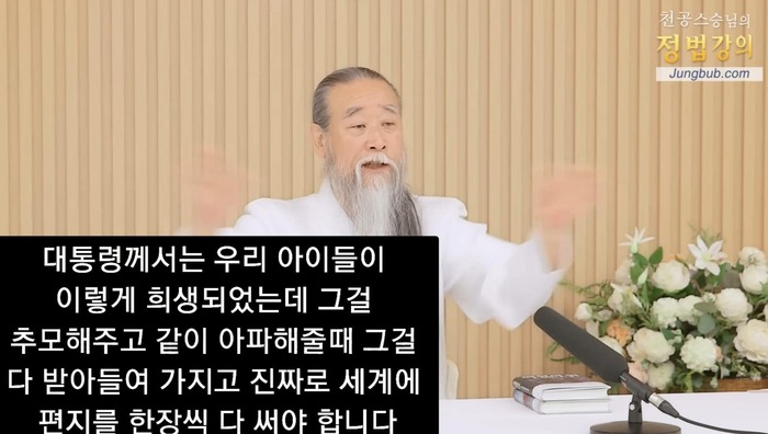 2일 천공은 자신의 유튜브 채널 ‘jungbub2013‘에 올린 정법강의 12642강 ‘세계 정상들이 보내온 애도메시지’라는 제목의 영상에서 이같이 말했다. 강의 전반에 20대 젊은이들이 대부분인 참사의 희생자들을 수단으로 삼아 국격을 높이자는 납득하기 어려운 주장을 내놓는다.