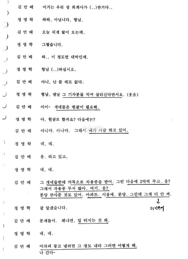 이에 정영학씨가 “아, 현찰로 할까요? 다음에는?”이라고 묻자 김만배씨는 “아니야. 아니야. 그래서 내가 지금 하고 있어”라고 말한다. 이어 김만배씨는 “걔네(기자)들한테 카톡으로 차용증을 받어. 그런 다음에 2억씩 주고. 그래서 차용증 무지 많아. 여기, 응? 분양받아준 것도 있어 아파트. 서울에. 분당”이라면서 로비 액수와 방법까지 제시한다.