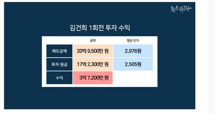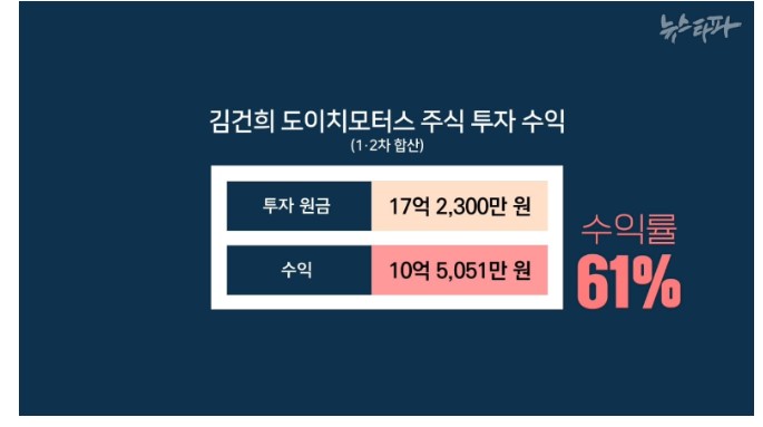 법원은 권 전 회장을 실패한 주가조작이라고 했지만, 김 여사는 이 기간 주식 매매 정황이 드러났다. '뉴스타파'에 따르면 김씨는 원금 17억을 2회전 시켜 1년 사이 10.5억 차익을 내 수익률이 무려 61%에 달해 수사에도 영향을 줄 것으로 보인다.
