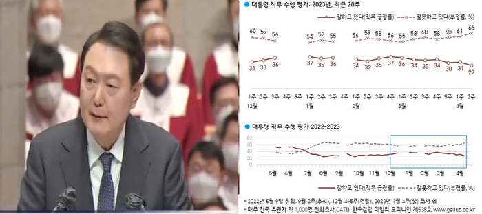 윤 대통령 지지율이 30% 아래로 떨어진 것은 올 들어 처음이다. 특히 이번주(한국갤럽, 4.14) 27%는 작년 10월 3주(27%) 이후 6개월 만에 가장 낮은 지지율이다. 앞서 윤 대통령은 작년 8월 초와 9월 말, 5세 취학 추진과 미국 방문 비속어 발언 논란으로 각각 24%로 최저치를 기록한바 있다. 앞으로 더 반등하리라는 보장도 없다.