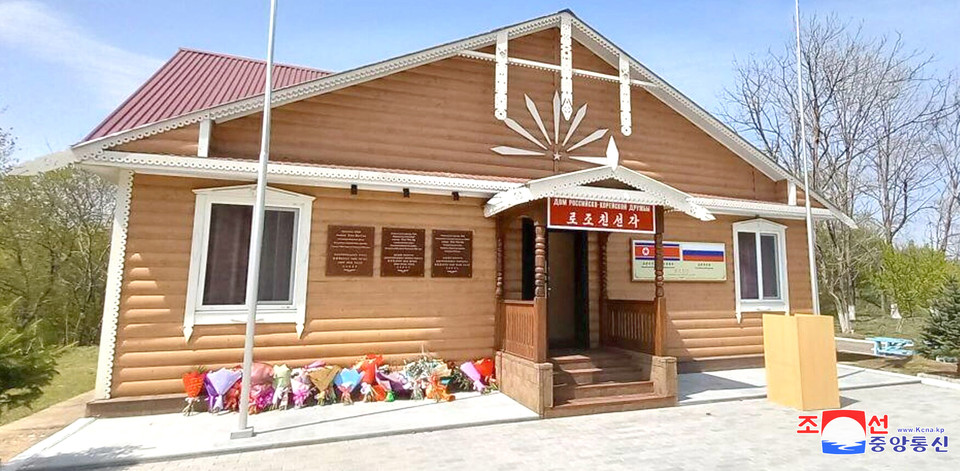 김일성생일 111주년(태양절)과 김정은 국무위원장의 러시아 방문 4주년에 즈음해 러시아 하싼에 있는 '러조친선각'에 김일성ㆍ김정일ㆍ김정은 방러기념 현판들이 러시아어와 조선어(한글)로 새로 제작돼 설치됐다고 조선중앙통신이 23일 보도했다. [=연합뉴스]