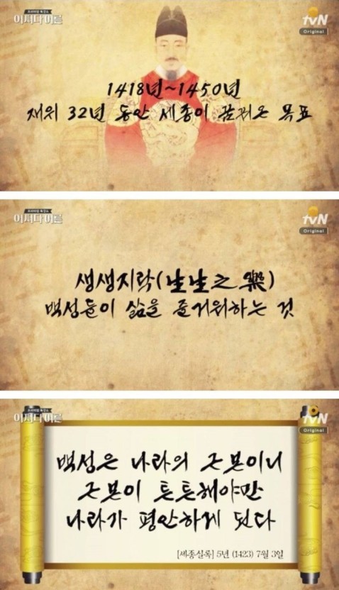 하지만 세종은 백성 처지에서 모든 백성이 글을 읽고 쓰는데, 어려움이 없었으면 하는 바람으로 한글을 창제하고 반포를 하게 되어, 백성들도 문자 생활이 가능하게 된 것이지요. 이처럼 재위 32년 동안, 세종이 꿈꿔온 목표는 모든 백성이 행복하게 사는 것이었습니다.