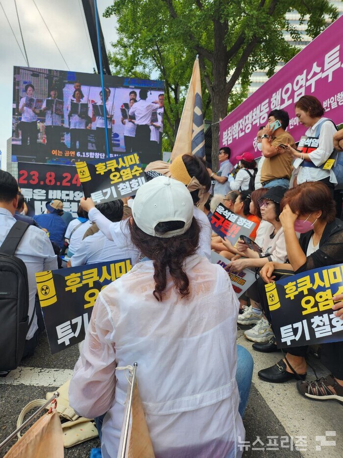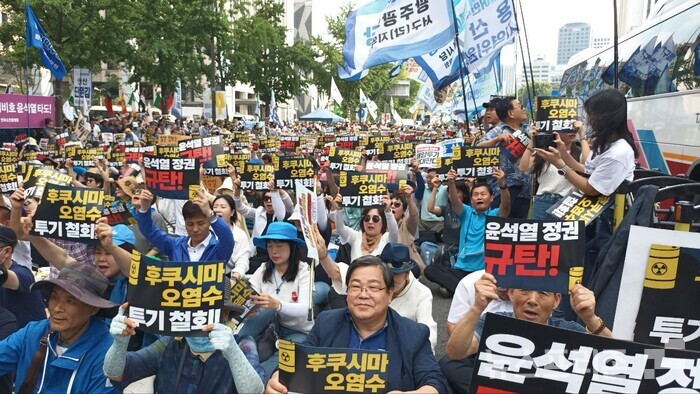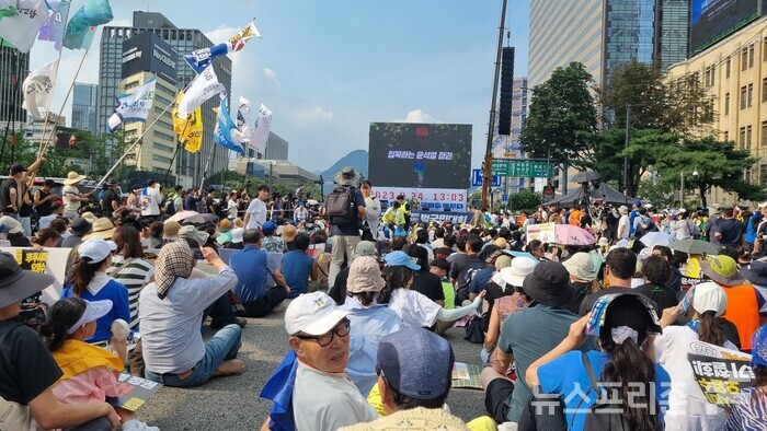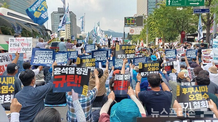 [서울 =뉴스프리존]김 석 기자= 26일, 일본이 후쿠시마 원전 오염수 방류를 지난 24일 강행한 지 사흘째를 맞은 가운데, 서울 도심에선 이에 반대하는 대규모 집회가 곳곳에서 열리고 있다.