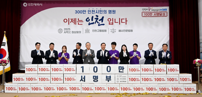 [인천=뉴스프리존] 김경은 기자=인천시는 지난 29일 시청 대회의실에서 2025 아시아·태평양경제협력체(APEC) 정상회의·인천고등법원·해사전문법원의 인천유치 성공을 기원하는 ‘범시민 100만 서명부 전달식’을 개최했다고 밝혔다.