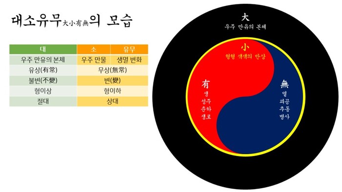 이 3이란 숫자는 1과 2가 합쳐 만들어진 것이며, 여기서 1은 양(陽), 2는 음(陰)을 뜻한다고 합니다. 《천부경(天符經)》에서는 하늘(一)은 사람(三)의 체(體)가 되고, 사람(三)은 하늘(一)의 용(用)이 되어, 하늘과 땅과 사람이 한 몸이 되는 삼 신 일체(三神一體)의 세계를 말합니다. 이를 삼 신(三神) 혹은 삼극(三極)이라고 하고, 이 삼(三)의 조화로 우주가 돌아간다고 보고 있지요.