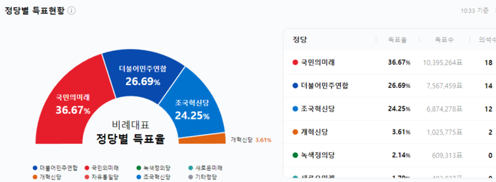 비례대표를 뽑는 정당 투표는 10시 33분 기준 약 99.97% 개표율을 기록한 가운데 국민의힘 위성정당인 국민의미래가 36.67% 민주당이 주도하는 더불어민주연합은 26.69%, 조국혁신당 24.25%, 개혁신당 3.61%다. 비례대표 당선권은 총 의석수 46석 가운데 국민의미래 18석, 민주연합 14석, 조국혁신당 12석, 개혁신당 1석으로 집계됐다.